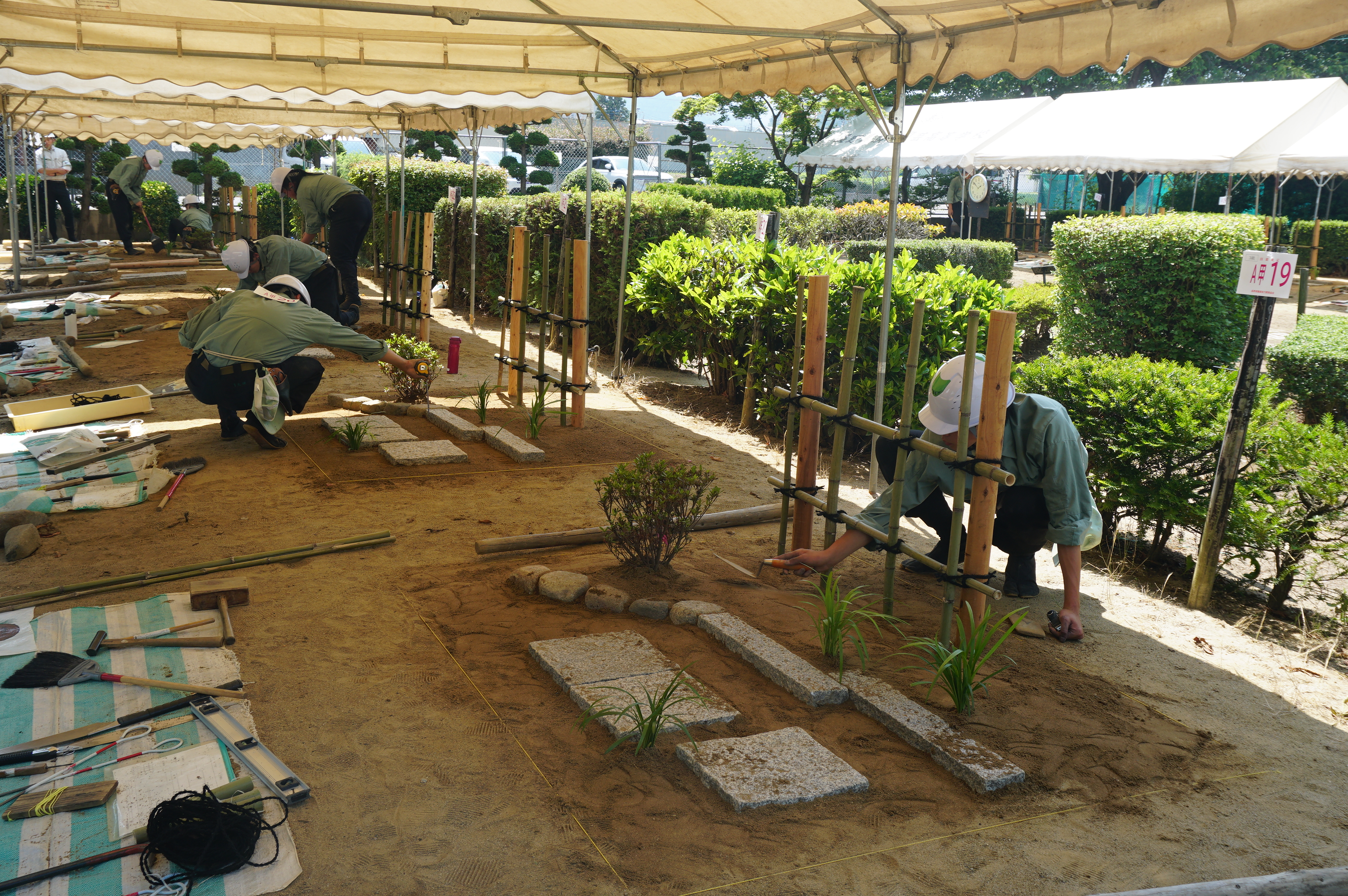 令和7年度長野県技能競技大会「造園工事」が開催されました。本競技は、縦2m×横1.5mの区画内で、竹垣の製作、縁石・敷石の敷設、植栽といった作業を、約2時間で仕上げるというものです。本校環境造園科3年生30名が挑戦し、2年間で培った知識と技能を存分に発揮しました。まっさらな地面から一つの庭を作り上げる経験を通して、生徒一人ひとりが大きな自信を持つことができたと思います。