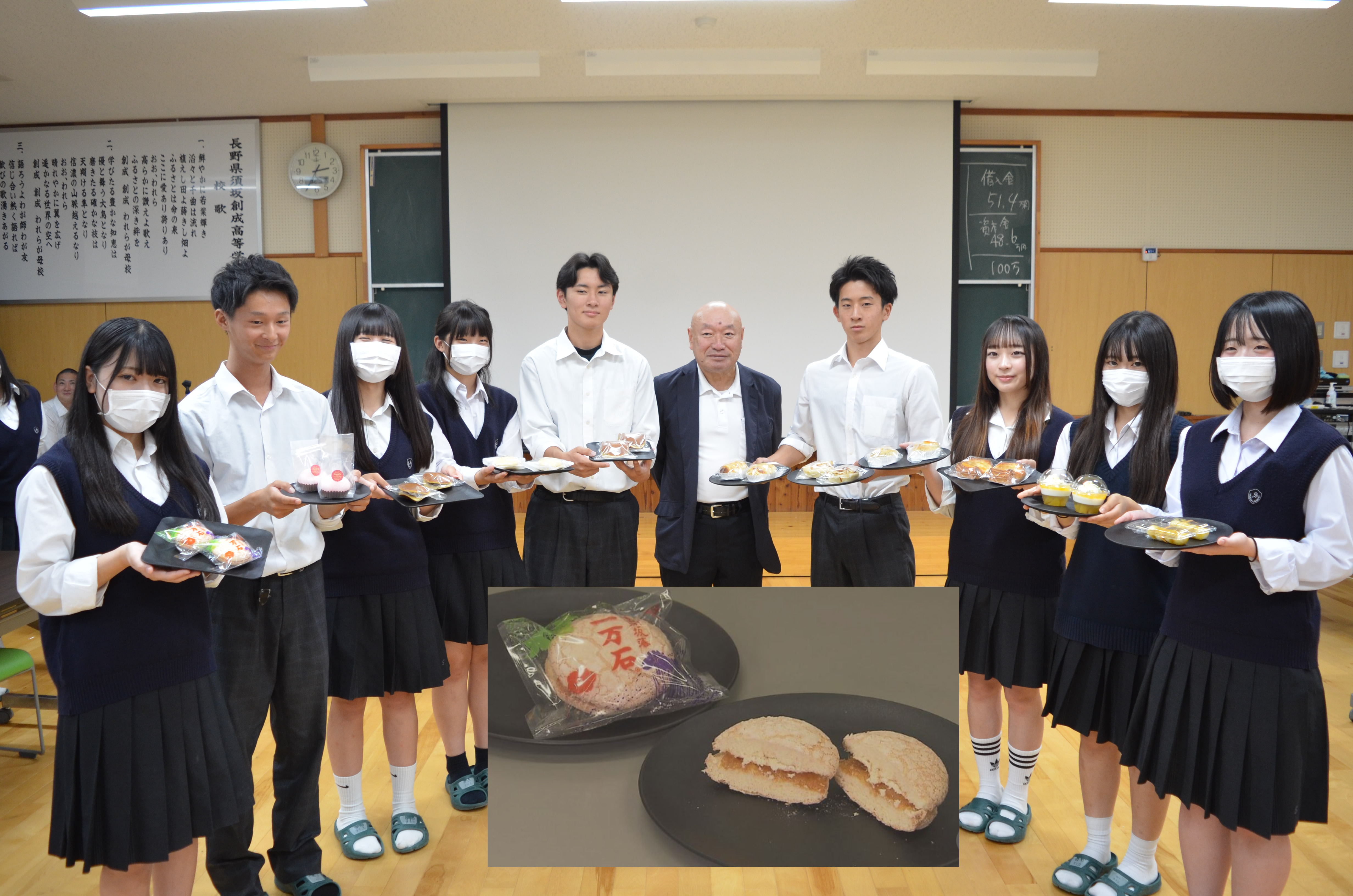 本校商業科マーケティングコースの3年生は、商品開発と流通の学習の一環として、地域の菓子店とコラボレーションし、須坂市特産の「ワッサー」を使ったスイーツなどを開発しました。「ワッサー」は須坂発祥で希少価値の高い桃とネクタリンの交配種です。今回の開発では、中村豊彦さんの農園で新鮮な素材を調達し、和洋菓子店「盛進堂製菓舗」と協力して、ワッサーのシロップ漬けをヨーグルトクリームに合わせた特製カステラを考案しました。カリカリとしたワッサー特有の食感が楽しめる新感覚スイーツで、須坂市のイメージアップにつなげたいという思いが込められています。